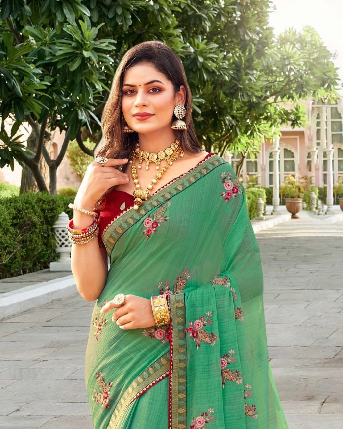 Floral Embroidered Chiffon Saree in Green Color with Unstitched Blouse